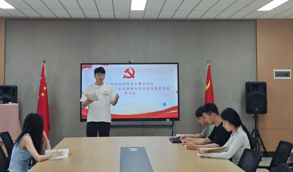 2025年5月12日上午,江西科技学院音乐舞蹈学院学生第一、第二党支部在YW2-208教室召开专题学习会,围绕《违反中央八项规定及其实施细则精神典型案例汇编》和《八项规定改变中国》展开学习。党支部书记梁智锋、组织委员昃晨、宣传委员李猛及全体党员同志参加会议。