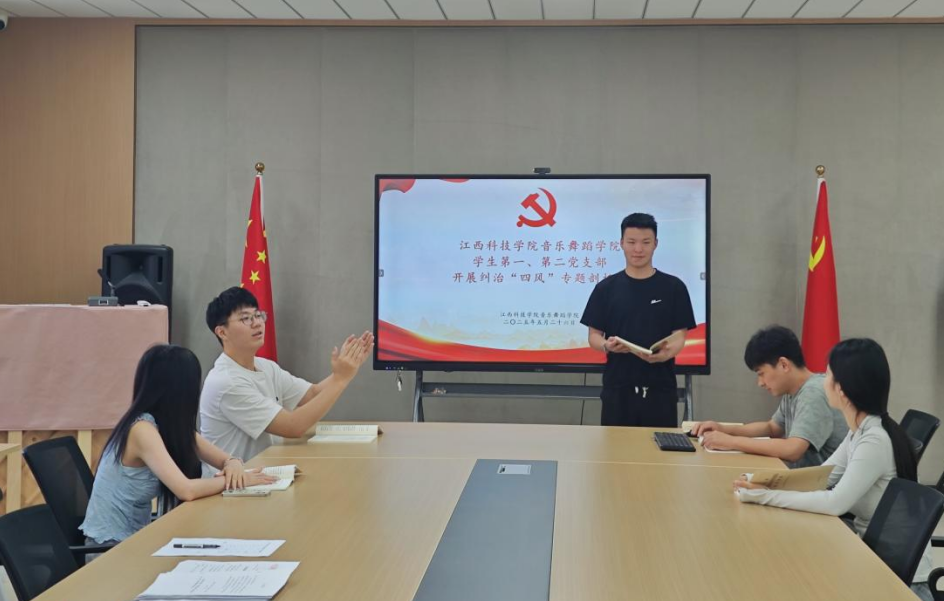 2025年5月26日上午,江西科技学院音乐舞蹈学院学生第一、第二党支部在YW2-208教室召开专题学习会,深入学习《习近平关于加强党的作风建设论述摘编》第五章——持续深化纠治“四风”及《违反中央八项规定及其实施细则精神典型案例汇编》。党支部书记梁智锋、组织委员昃晨、宣传委员李猛及全体党员同志参加会议。