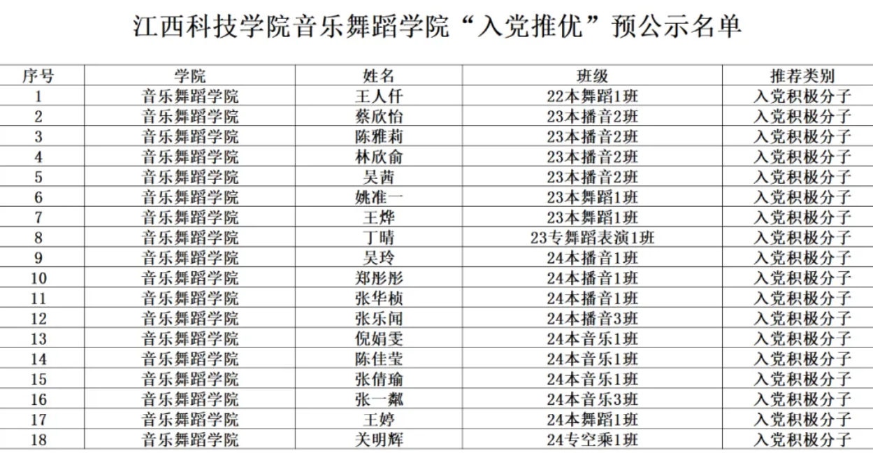 为贯彻落实习近平总书记关于加强新时代团员队伍先进性建设的重要指示,深入推进全面从严治团,优化团员队伍规模结构,提升青年党员质量。根据《中国共产党章程》《中国共产主义青年团章程》和《中共中央组织部、共青团中央关于进一步做好推荐优秀团员作党的发展对象工作的意见》《中共中央组织部关于进一步加强在青年中发展党员工作的意见》《中国共产党发展党员工作细则》《共青团推优入党工作实施办法(试行)》等相关文件规定,经过学生自主申请、团支部推荐,学校团委考核,报上级团组织审批,确定以下同学为江西科技学院音乐舞蹈学院2025年上半年共青团第一次“推优”候选人,现将名单预公示如下: